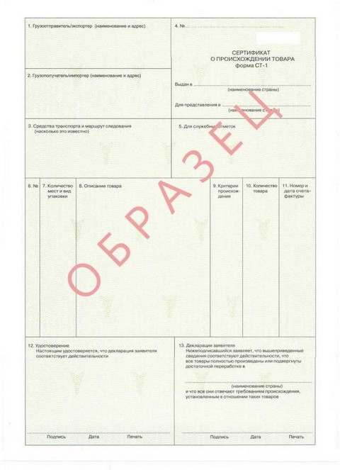 На территории России установлен единый порядок получения сертификатов СТ-1, регламентированный законом "О Торгово-промышленных палатах в РФ", принятым 07.07.1993. Документ оформляется на каждую отдельную поставку продукции.
